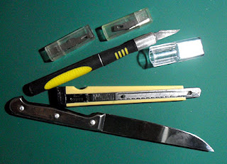 Ini adalah alat yang paling mudah anda jumpai. Anda bisa mendapatkannya dengan di toko-toko buku dengan beragam harga. Pilihlah pisau cutter dengan slot pisau yang terbuat dari besi. Dalam memahat anda kadang menekan dengan sangat kuat, jika slotnya hanya terbuat dari plastik, maka slot tersebut akan mudah rusak. Untuk hobby knife, biasanya nomor mata pisau yang paling sering saya pakai adalah no.11. Di beberapa toko hardware, kadang tersedia hobby knife dengan beragam mata pisau yang dijual dengan harga yang cukup terjangkau.